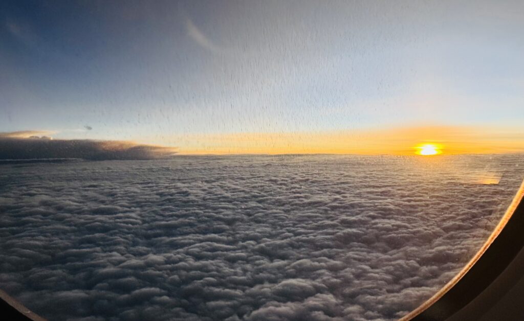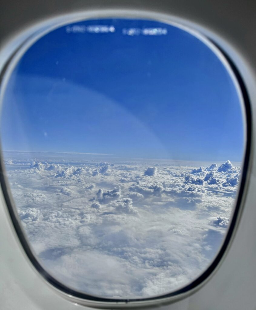 Herrlicher Sonnenaufgang über dem Wolkenmeer. Dann gab es ein leckeres Frühstück, und vor der Landung in Johannesburg mussten wir noch ein imposantes Wolkengebirge durchfliegen.