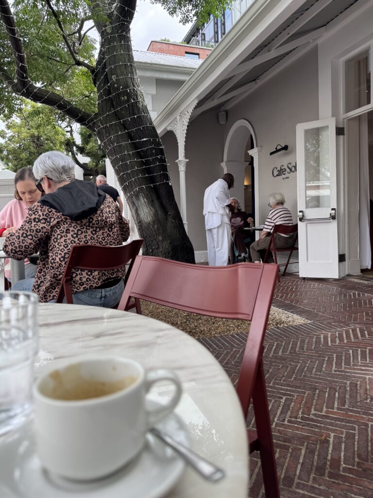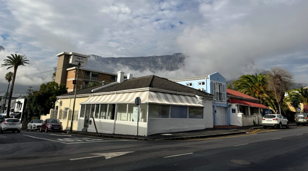 Da heute ein regnerischer Tag vorausgesagt war, musste der Tafelberg noch warten und die Reisegruppe fuhr nach dem Frühstück zum Kap der Guten Hoffnung. Als ich wenig später zu einer kleinen Runde durch das Quartier aufbrach, war das Wetter schon ein bisschen freundlicher. Gefühlt alle Kapstädter waren vor den Feiertagen beim Einkaufen und trafen sich dann zum Frühstück in einem der zahlreichen Cafes.